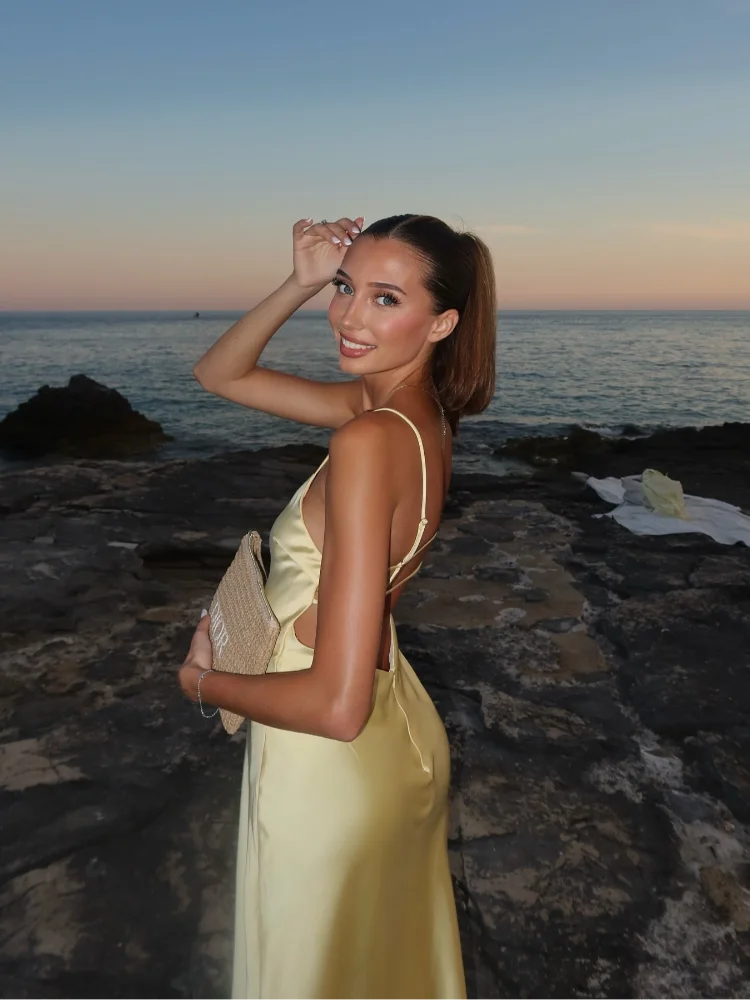 This elegant casual dress features a fluid silhouette with delicate shoulder straps and a softly draped neckline. Designed to follow the natural line of the body, it transitions seamlessly from sunset gatherings to evening occasions.